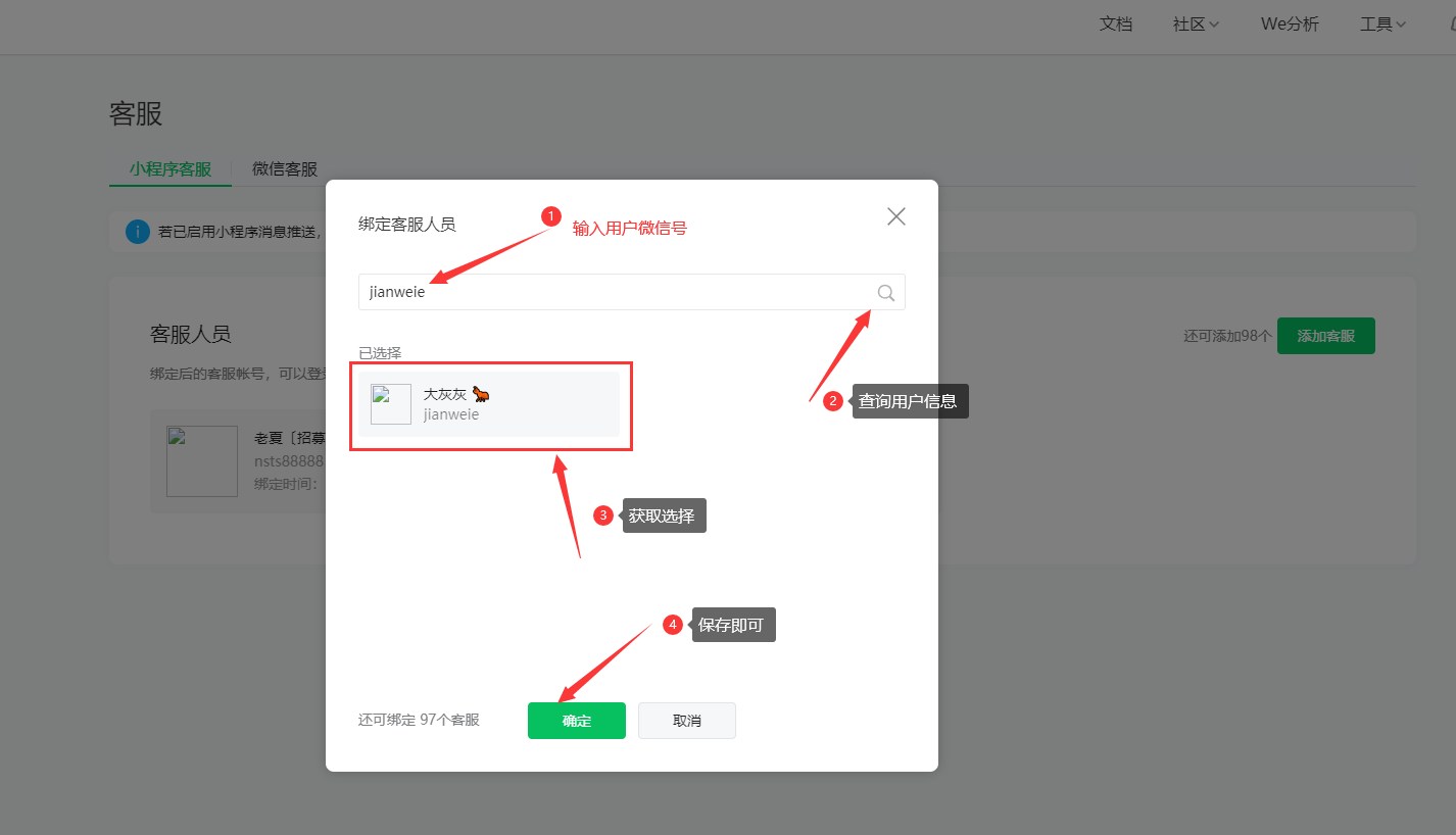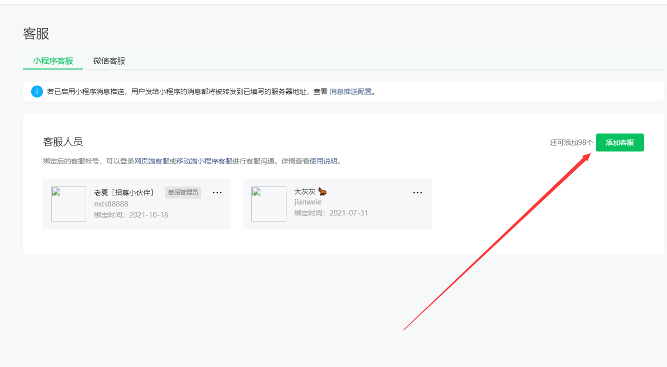 首先我们登录微信小程序管理平台,点击左侧的【功能】【客服】,然后点击开通,并添加客服人员的微信。