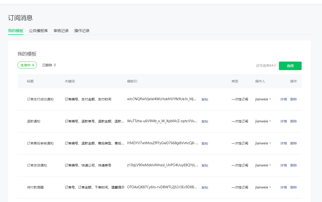 默认情况下,消息模板是未开通状态,需要主动申请开通,开通之后如以下界面。