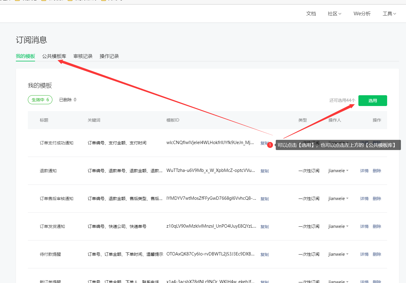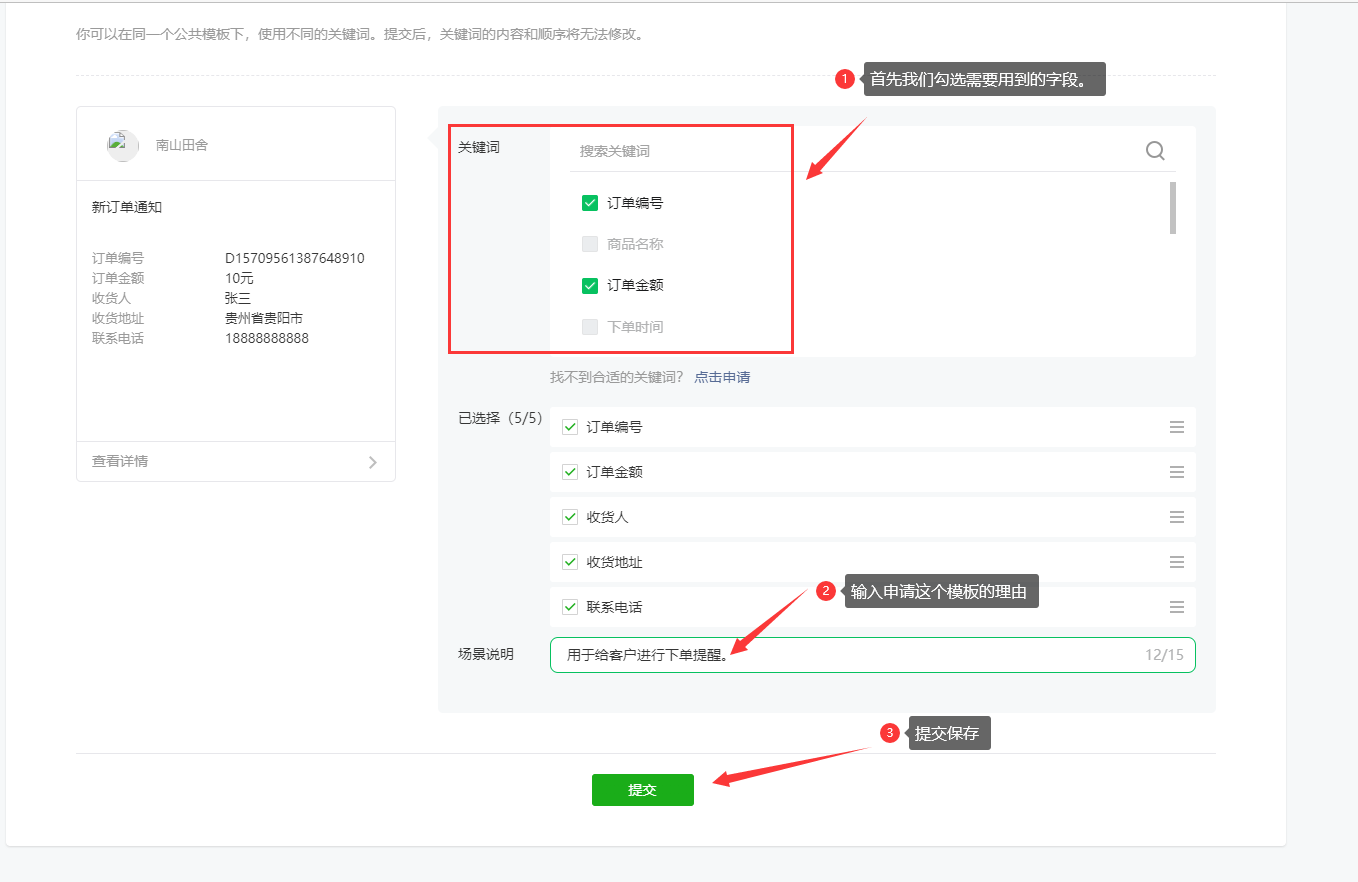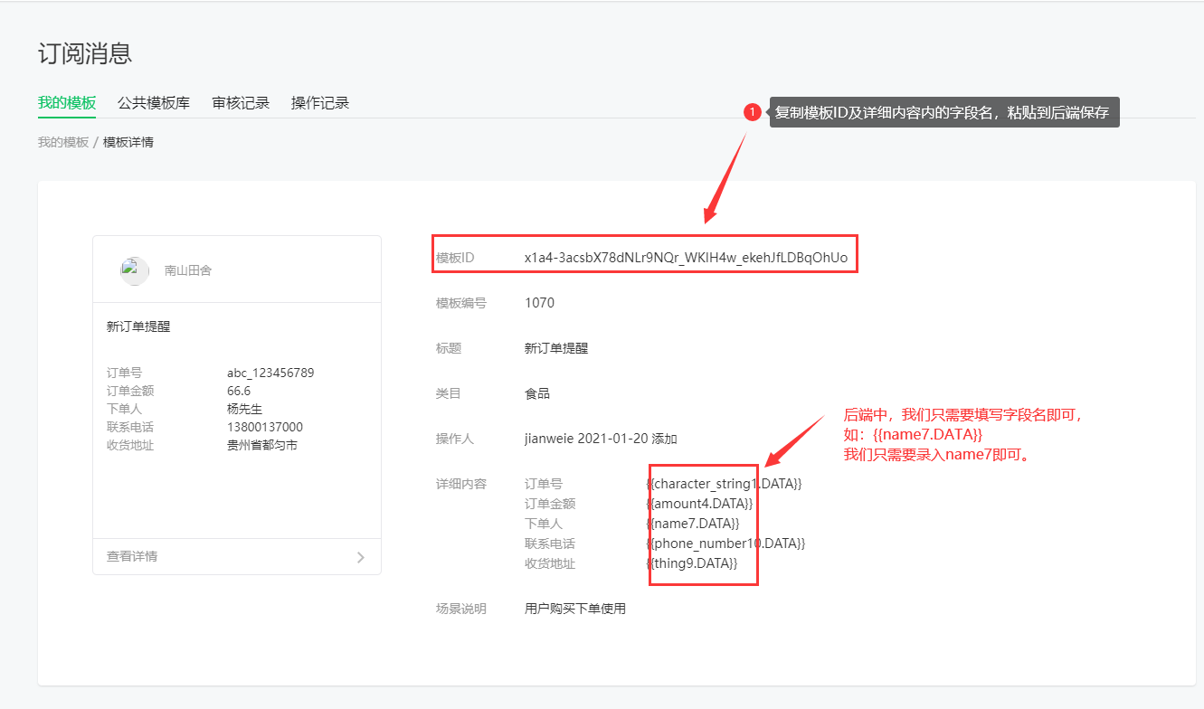 我们看到不同的消息类型,已经预制了不同规格的表格需要填写。比如【下单通知】,我们看到有6个表格,除了第一个是我们申请消息模板后的序列号,其他的为内容字段。