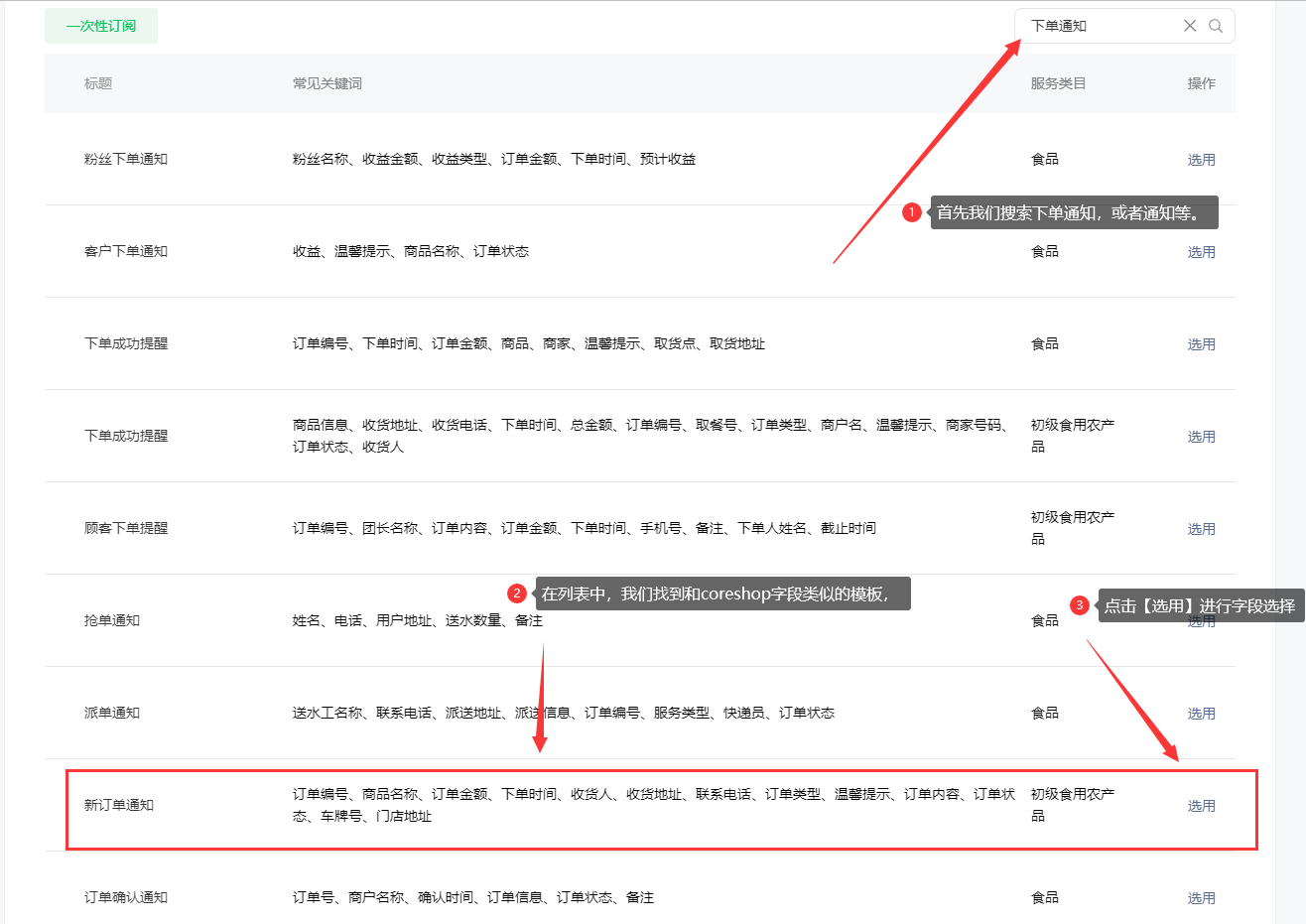 现在,我们打开coreshop的后台。根据需求选择合适的消息模板。