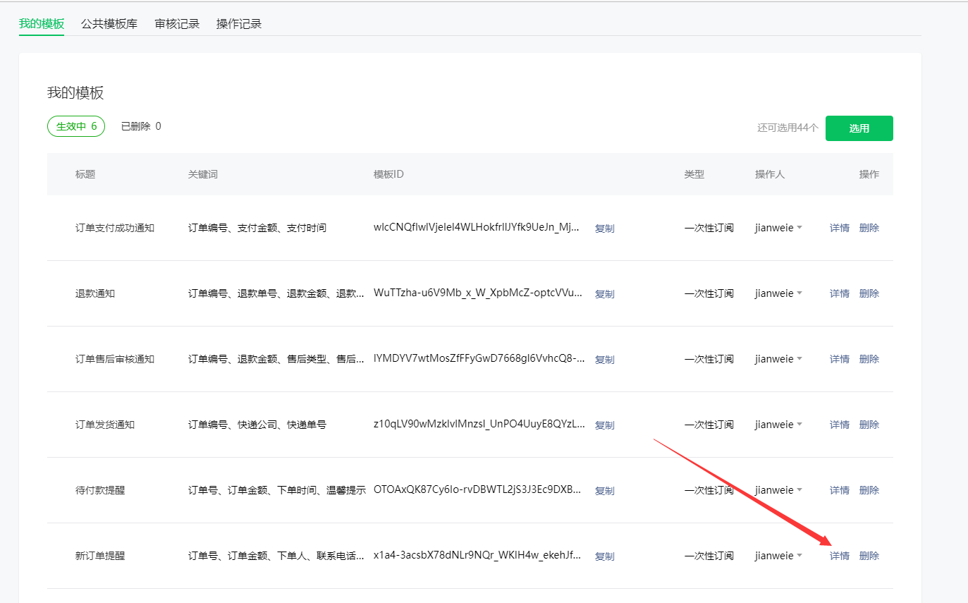 提交之后,会进入审核状态,原则上,提交基本上就能马上审核通过,然后在我的模板中,就能看到,我们点击详情。